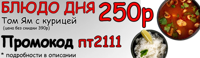 куриное филе, шампиньоны, бульон на основе кокосового молока, пасты Том Ям, лемонграсса и тайских специй, подается с рисом